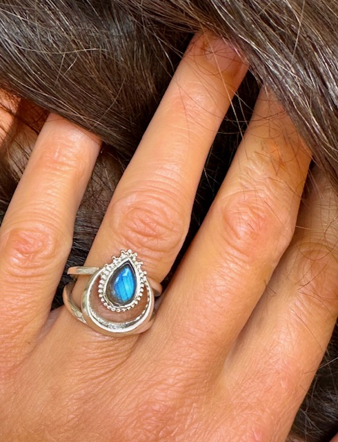 Façonnée à la main au Rajasthan en Inde, elle est réglable pour s’adapter à votre doigt.