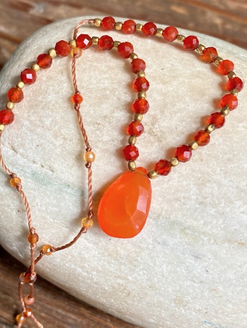 Ce collier flamboyant et raffiné en coton et soie beige est parsemé de perles de cornaline facettées, pour en magnifier tout leur éclat.  Le pendentif est une magnifique goutte de cornaline naturelle.