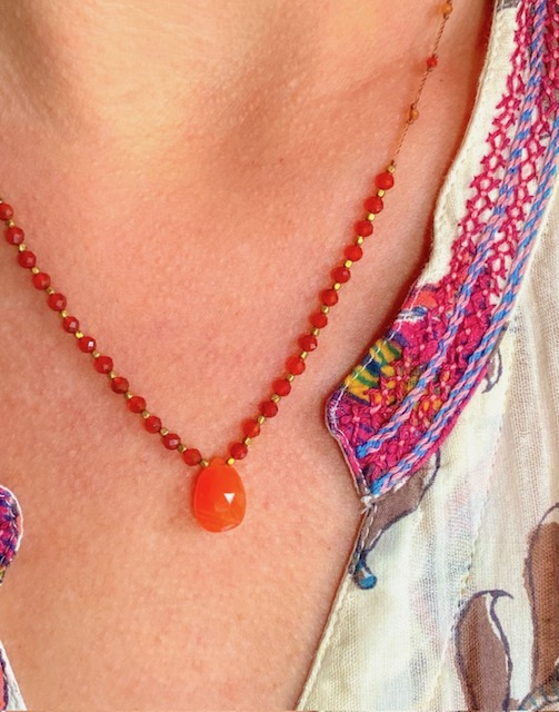 Ce collier flamboyant et raffiné en coton et soie beige est parsemé de perles de cornaline facettées, pour en magnifier tout leur éclat.  Le pendentif est une magnifique goutte de cornaline naturelle. C’est une pierre de feu symbole de joie, de charisme et de spontanéité.